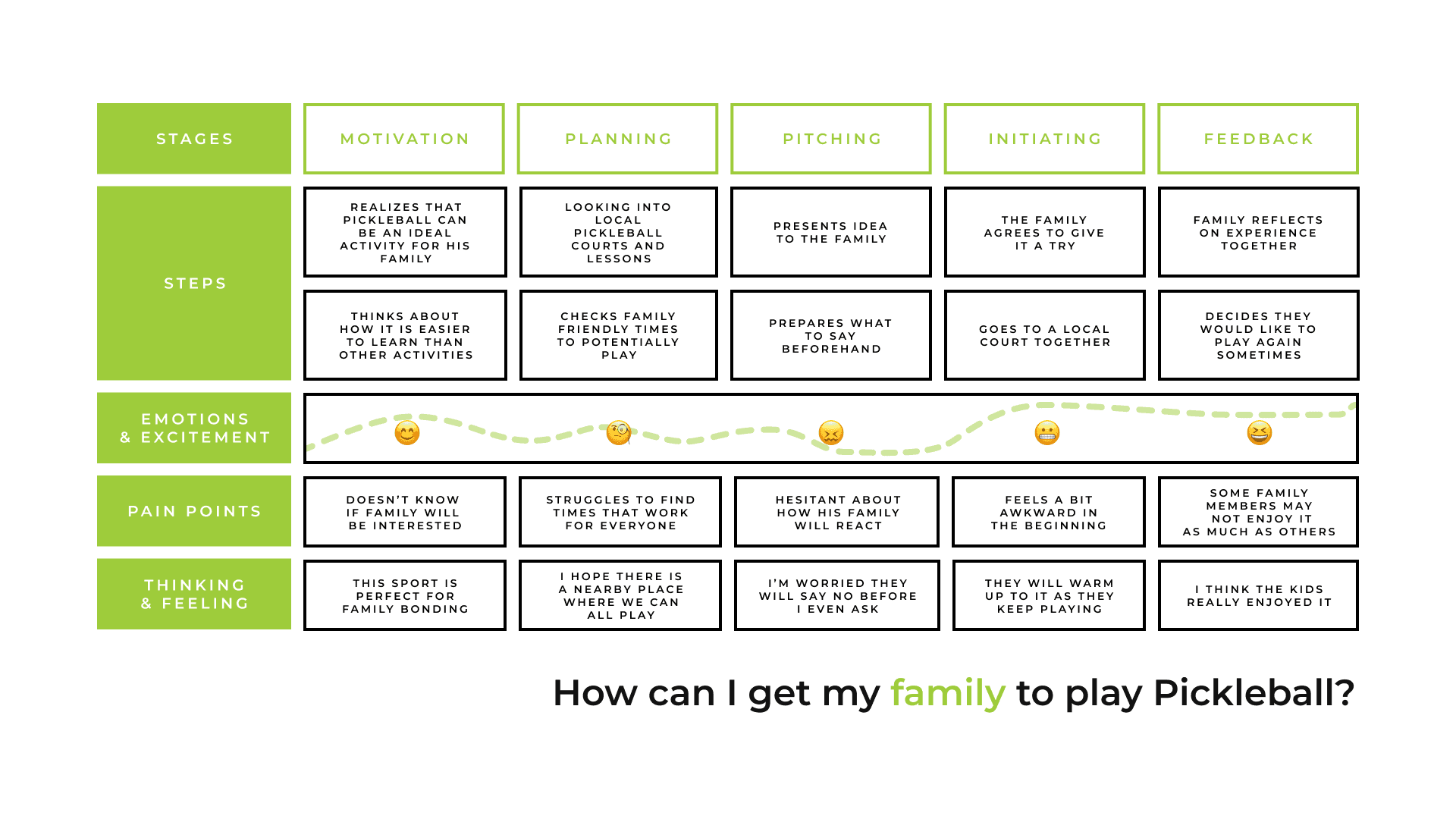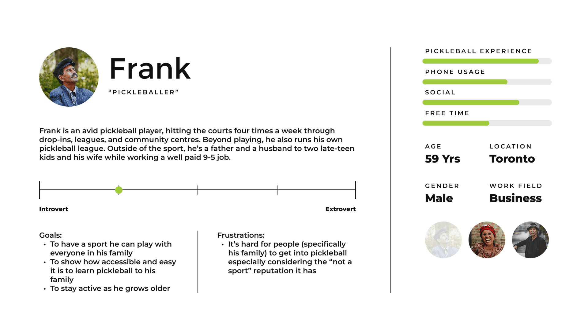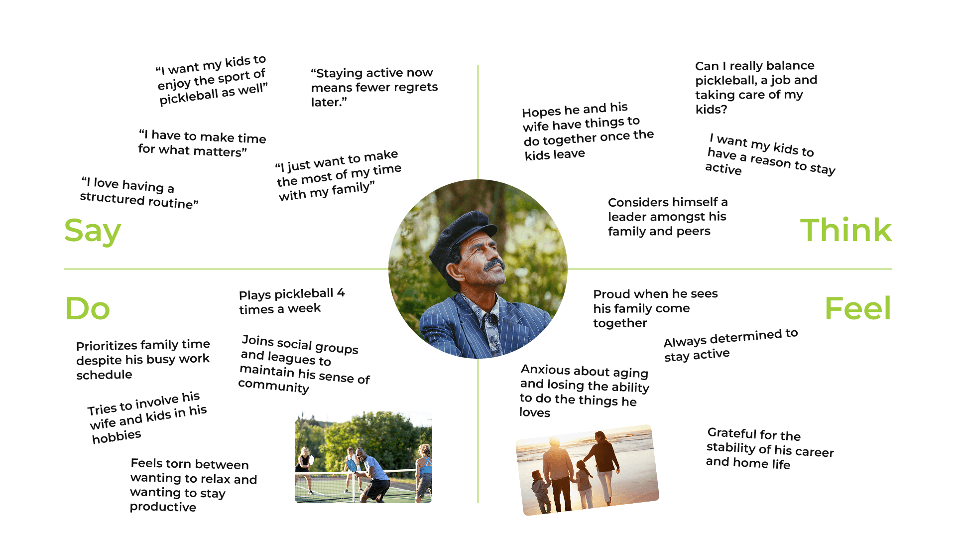 Many Baby Boomers want to stay active and socially engaged, but barriers such as fear, inexperience, and lack of guidance can make it difficult to start new physical activities. This raised the question: how might we help Baby Boomers overcome these barriers and feel more confident trying something new? Through our initial research, pickleball emerged as a strong opportunity to explore.